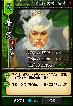 作為蜀漢五虎大將之一的關內侯黃忠雖為老將,但老當益壯,刀箭雙絕,手中赤刀血刃百人,無雙箭術百發百中,在定軍山斬殺夏侯淵,更是讓眾多年輕將士望塵莫及。今日起,主公便可招募這位驍勇善戰的經驗老將,將其劃入麾下。