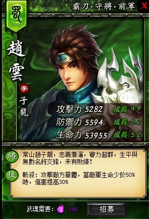 銀鎧白馬,血染征袍,誰與爭鋒!三國人才濟濟,而常山趙子龍則是眾位猛將中近乎完美的一位,因此膽識過人,武藝高強且重信義的趙雲自然成為了人氣極高的一名武將。而今日主公將可以招募這位人氣武將,壯大己方戰力。