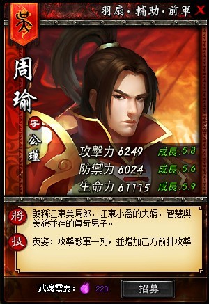 周瑜的獨有武將技能「英姿」在出戰時能給對攻擊敵軍一列目標,並且增加己方的前排戰鬥力,這樣的強悍的技能可是比美貌更加分。