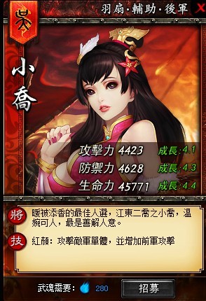 三國時期是世人皆知的美人小喬在遊戲中可不僅僅是美麗的花瓶,本次更新中,溫婉動人的小喬帶著武將技能「紅顏」前來協助主公。兩軍交戰時,小喬的武將技能除了能夠攻擊敵軍單體外,還能振奮士氣,增加前軍的攻擊,提升全隊攻擊輸出。