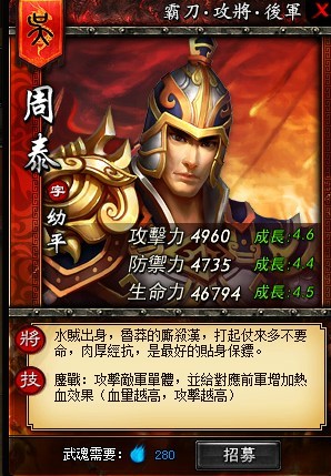 三番救主出重圍,忠勇如公世所稀!膽氣絕倫、誓死捍衛主公的周幼平是戰場上少見的熱血將軍,即使遍體鱗傷,依舊無動於衷勇戰退敵,相信會是主公身旁最好的貼身保鏢。其武將技能「鏖戰」攻擊敵軍單體的同時為己方前軍熱血提升其戰鬥力。