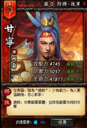 上陣時,甘寧的獨有武將技能「錦帆」在攻擊敵軍單體的同時 ,還能降低敵軍攻將的攻擊,保證了自身隊伍的存活率。