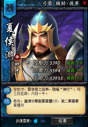 在行軍征戰方面頗具妙才的典軍校尉夏侯淵擅於千里奔襲,三日可行五百里,六日可赴千里,常常出敵不意,給予致命一擊。出戰時,夏侯淵的武將技能「奇兵」可出趁敵不備連續攻擊兩次,第二次攻擊將有更大幾率出現暴擊。