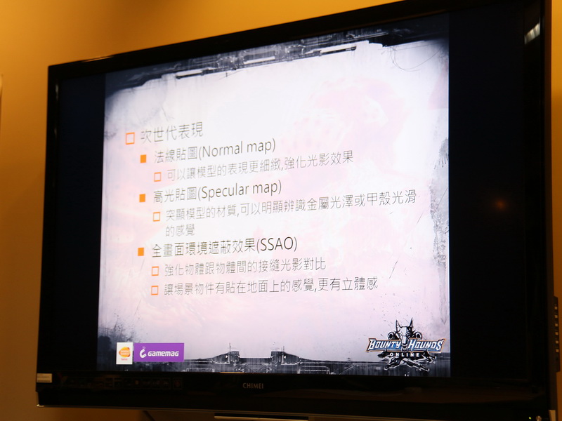 技術總監黃仁賢主要針對 《星戰傭兵 Online 》次世代技術、臨場感等效果進行介紹。在次世代技術方面主要分為三個階段,法線貼圖 、高光貼圖 以及全畫面環境遮蔽效果。