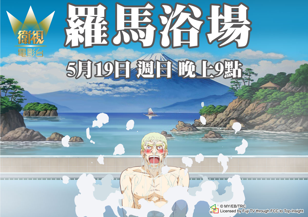 由日本漫畫家山崎麻里(ヤマザキマリ)的知名暢銷漫畫作品改編的《羅馬浴場》,系列作在日本熱銷 500 萬本,2012 年推出的真人電影版,首週全台票房累積 2 千 5 百萬,創下近年日片在台的最佳紀錄。動畫版也將在 5 月 19 日(週日)晚間 9 點至 11 點於衛視電影台首播。
