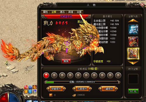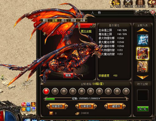 隨著品階的提升,坐騎的移動速度將愈快速,為主人附加的基本屬性將越來越強大。與此同時坐騎的每次進階,都將脫胎換骨,以全新的霸氣造型重現於世。