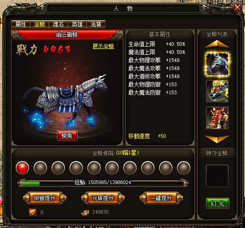 英雄通過任務劇情的考驗後,便可開啟高階玩法「坐騎系統」,獲得最初的戰神愛駒「幽云戰騎」。在「人物」面板中點選「坐騎」頁籤便可以查看所駕馭坐騎的全部屬性。除了執行任務時能夠直接感受到的移動速度倍增外,愛騎還能夠幫助英雄提升生命值、魔法值、攻擊和防禦等各項屬性的最大值。