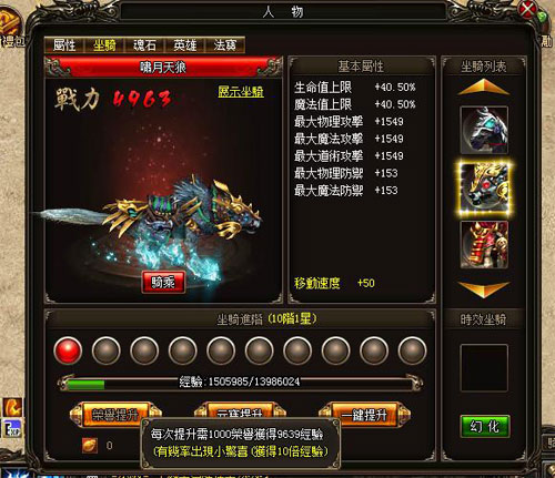 在「坐騎」頁籤中,英雄可以選擇各種提升方式為培養自己的戰騎,最為常用的自然是「榮譽提升」,英雄可通過消耗一定的榮譽點來獲取坐騎經驗值。除了「榮譽提升」外,培養坐騎還能通過「元寶提升」和 VIP 專屬的「一鍵提升」。