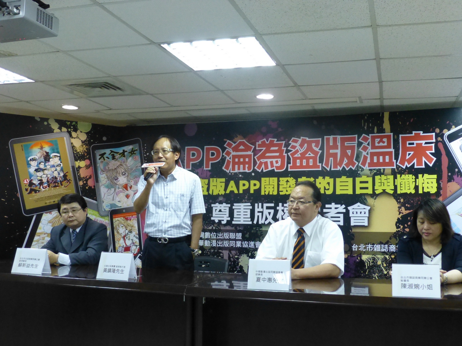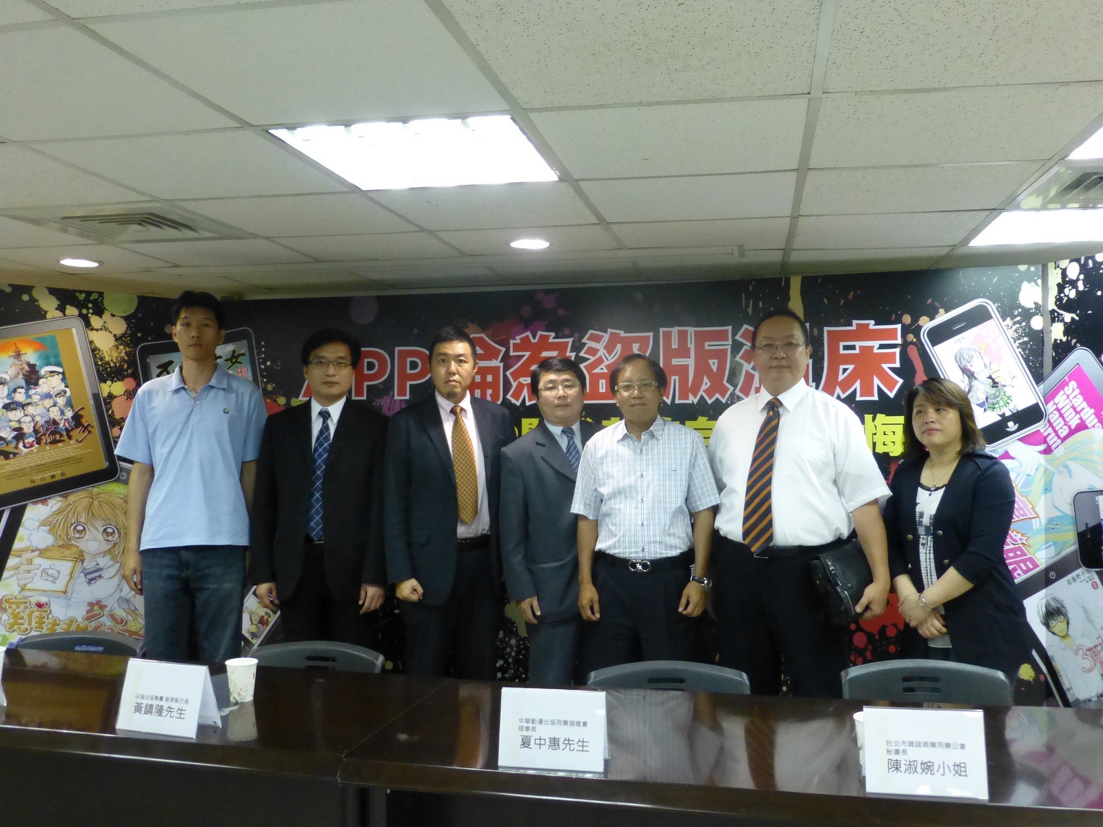 (左起)盜版APP開發者簡浩洋、城邦媒體控股集團法務部經理邱大山、台灣數位出版聯盟副秘書長祝本堯、台北市出版商業同業公會副理事長蘇新益、尖端出版集團黃鎮隆首席執行長黃鎮隆、中華動漫出版同業協進會理事長夏中惠、台北市雜誌商業同業公秘書長會陳淑婉