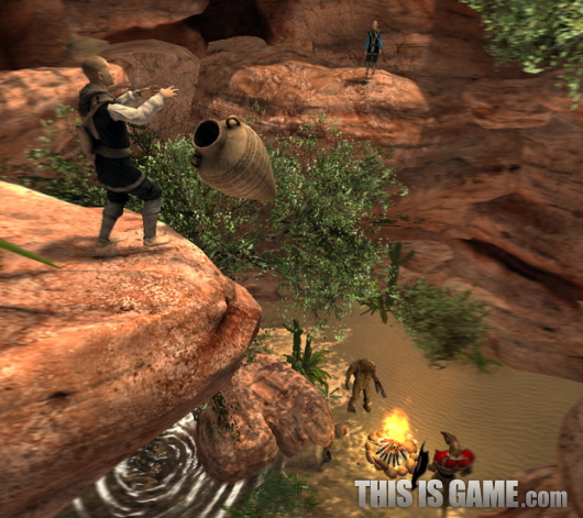 多人遊戲畫面,兩個玩家合作投下石頭攻擊敵人的畫面