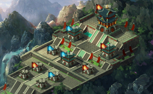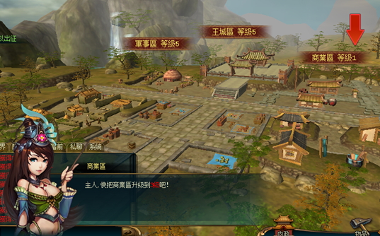 隨著等級的提升,玩家持有的主城建築也會依序開啟。軍事區一開始就會存在,接著將依序開放商業區、英雄鋪之類的功能性建物,每個建築也都代表著不同功能,想要武將等級夠高,就必須升級軍事區;而升級商業區則可以提高強化上限。