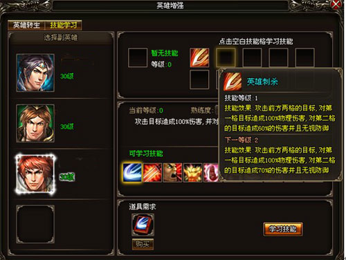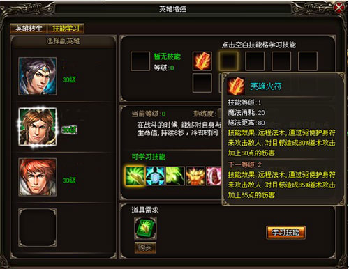 除了職業技能外,英雄還自動習得增加玩家角色與英雄生命值、魔法值、攻擊值等各項屬性的被動技能,技能等級越高,增益效果越強。
