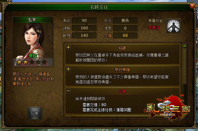 遊戲初期,玩家結識武將後,還有任務幫助您提升與武將的交情,直接就能將初識的武將招募到你的隊伍中。但到了等級 19 左右,成功延攬本階段最後一個武將後,往後結識的武將,都必須完成其提出的任務,增加交情,才能達成招募的條件。