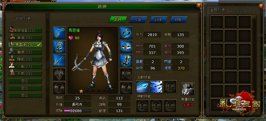 點選「將領」介面,可以看到玩家所持有的武將,並透過裝備道具、技能、「培養」、「訓練」以及「轉職」功能,強化武將能力屬性,或是通過裝備的進階升級,也能提升屬性,使其成為你的得力助手!除此之外,每個武將都有其專屬技能,當玩家完成「名將任務」,將交情升高到指定數值,即可激活武將技能,大大提升武將戰力。