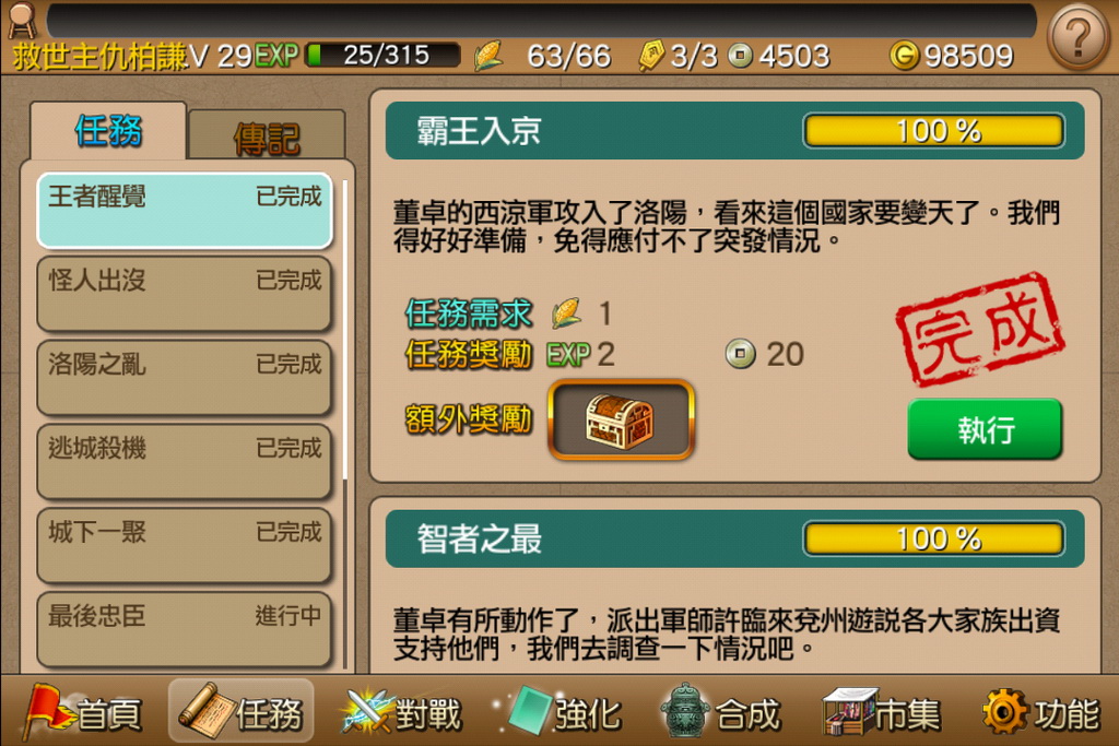 阿文: 任務模式像大多卡牌遊戲一樣,要消耗行動力來推動故事,而行動力會經過時間來恢復。任務內容主要是按照漫畫故事去製作,因為玩家是傭兵的關係,所以很多漫畫中的戰場也可以參與。當然遊戲故事會跟著原著故事發展,只是很多微細的情節,陳某老師可能比較沒有仔細描述,只用一張圖片或一句說話帶過,研發團隊就在遊戲中藉由原創的方式解釋清楚。例如「城下一聚」的時候 劉備如何現身在敵軍之中,以及「徐州之戰」郭嘉如何攻下徐州首府,這裡我們會都試著進行補完。