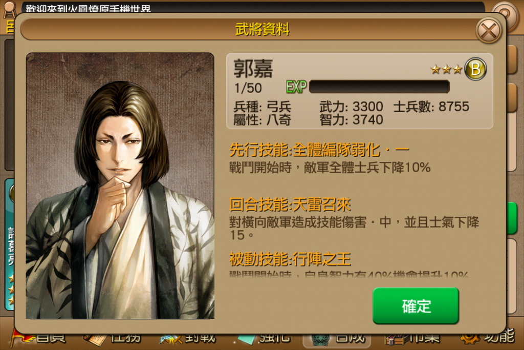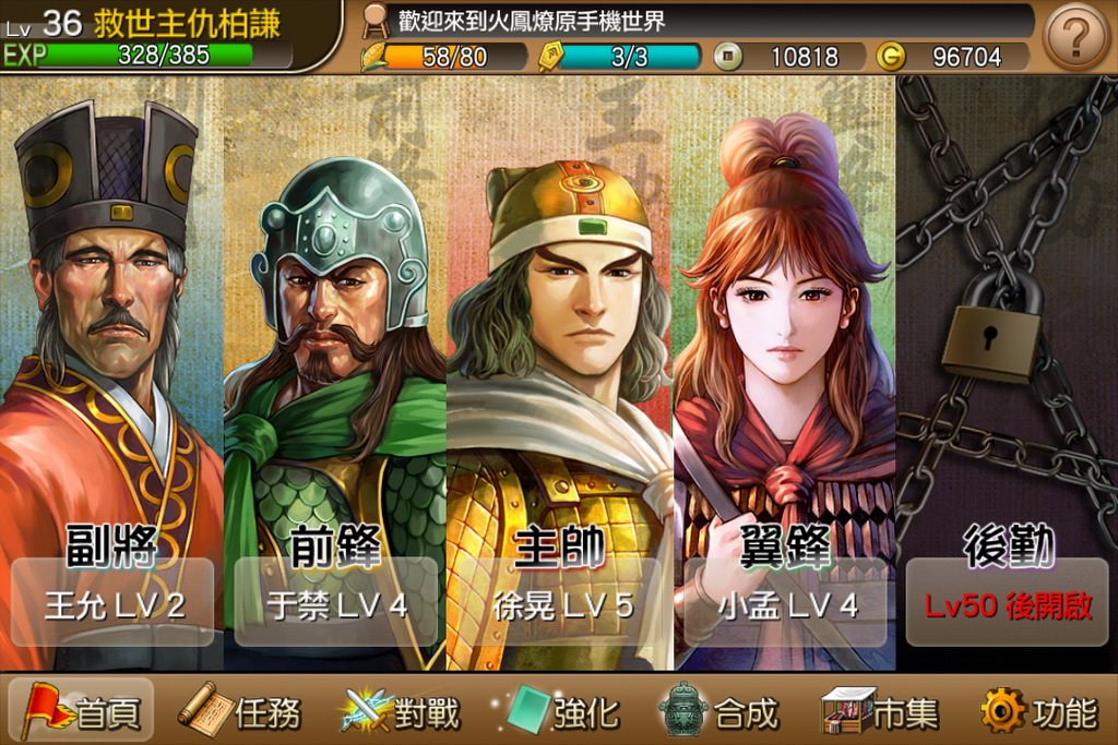 玩家進去遊戲的時候,一開始可以選一個武將,等到達到指定等級的時候,再開一格,到達 50 級的時候就可以選擇 5 個武將了。