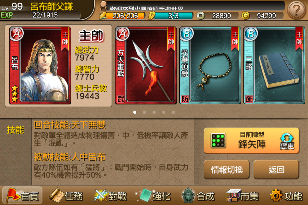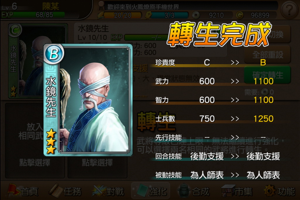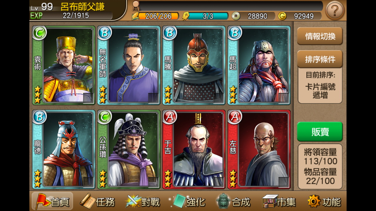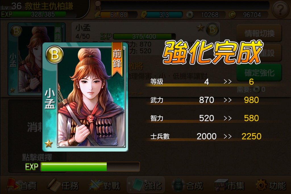 James: 強化將領只要消耗遊戲幣及其他將領卡片可以,收集更多的將領再進化,是增強戰力的不二法門。