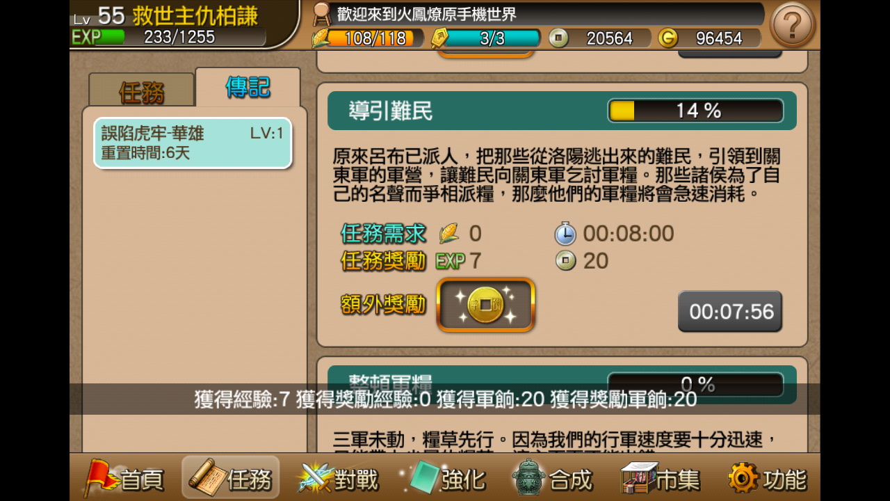 遊戲中還會有所謂的「傳記」,主要是讓玩家以各個將領的視點去體會不同戰場,也就是在特定時間出現的活動。舉例來說這星期才有的「傳記」,規定玩家要在這星期打滿多少場,才可以拿到 A 級燎原火卡片(純屬舉例),傳記不用扣體力值,但是會有時間限定,例如多久時間才可以再執行一次,這是獲取卡片的另一種管道,而任務則是只要有體力值就可以執行。