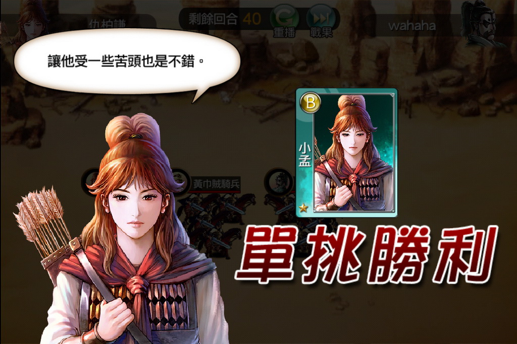 阿文: 例如燎原火就是殘兵之首,所以他的技能可以提昇 20% 的「殘兵」屬性的將領戰鬥力數值。至於像呂布被稱為「人中呂布」,如果對手的卡牌中出現猛將,則有 40% 的機會發動提昇我方 50% 的攻擊力,可以說是有點相剋的感覺,而像有的屬性的卡牌才可以單挑,所以屬性的區分相當明顯。