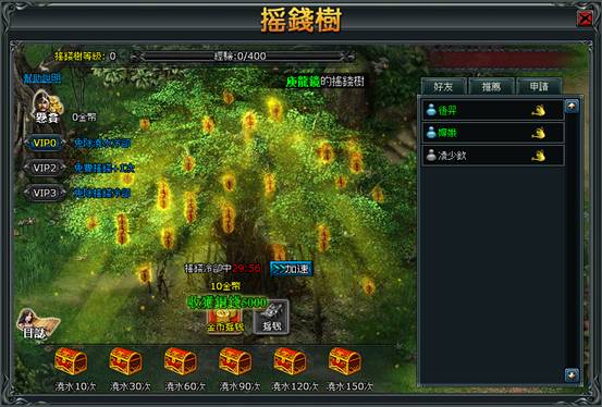 每個玩家每天可以免費搖 3 次搖錢樹,每次最少都能拿 5000 銅錢,加在一起就有超過 15000 銅錢之多!而且,搖錢樹是一種長久收益,自己等級高了還可以提高每次收穫。