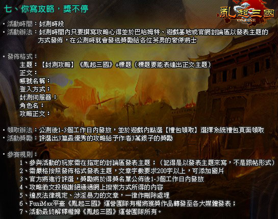 最後,玩出心得的玩家,若能撰寫攻略並以指定格式發佈在特定討論區,經過評選後選出三篇獲得豐富獎賞!