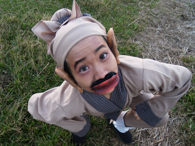 阿兆:那個倒是沒辛苦修羅啥道具,但最麻煩的是要塗黑妝XDDD, 我第一次塗黑妝就獻給他了,道具大耳朵也跟著要塗,塗完的當下覺得自己好像土裡打滾過 好髒XD。香腸嘴當時很難裝上嘴唇,所以我就直接 3M 一黏,Cos 完要撕下來的時候真是爽ㄎㄎ,感覺真的腫成香腸了這樣XD。