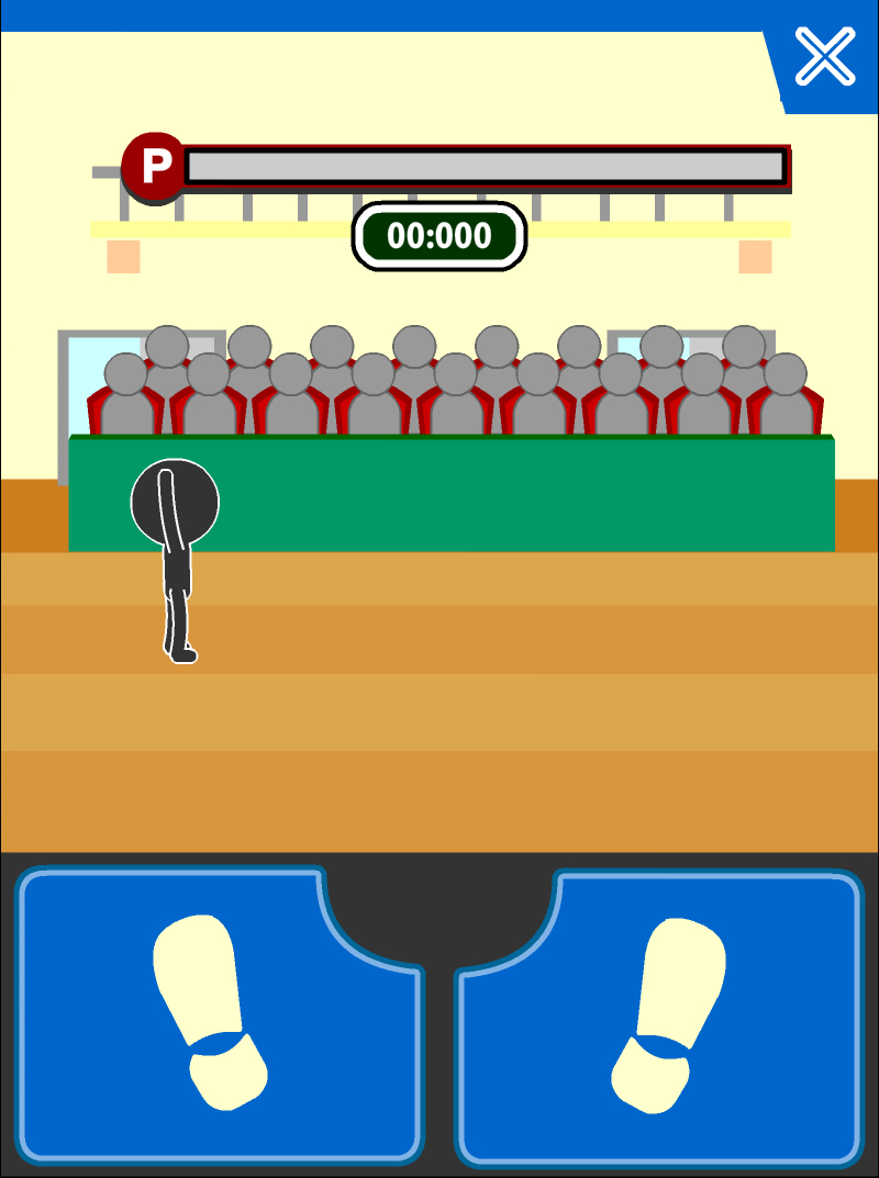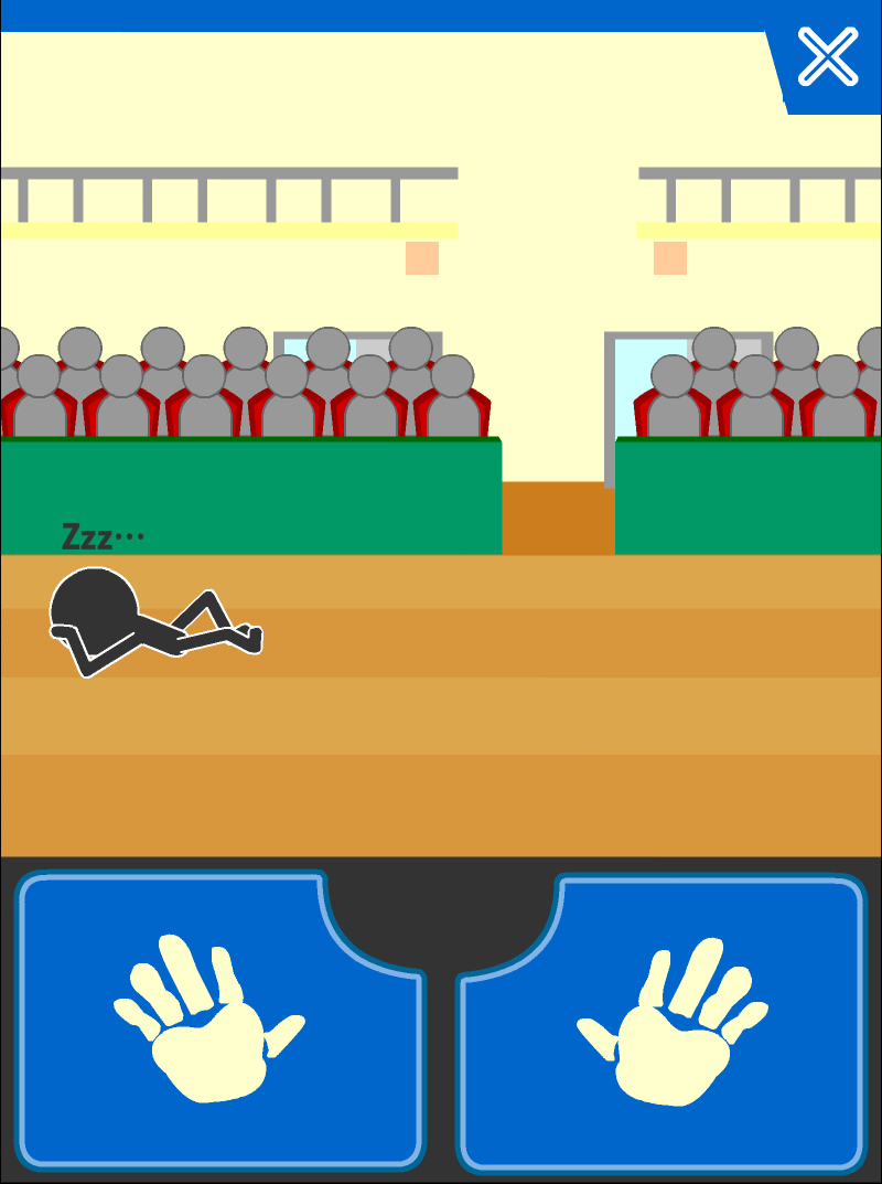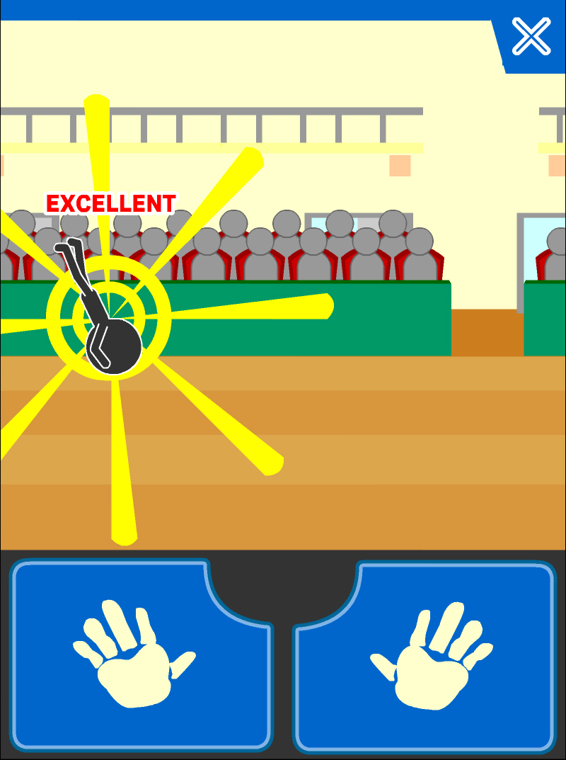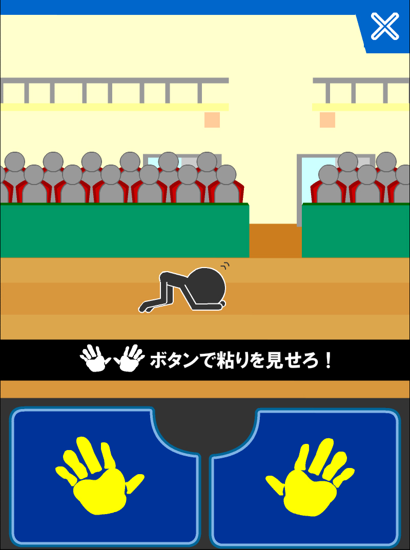 輸入完著地技之後,主角終於掉下來了。快接近地面的時候按下畫面下方的手型按鈕來著地吧。按下這顆按鈕的時機只要越接近地面就越高分,不過太慢按的話就會插在地上而結束遊戲。