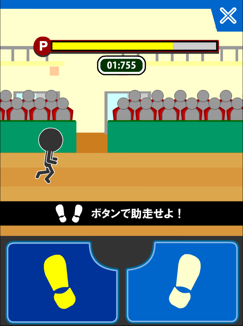 一開始進行的助跑只要以觸碰連打畫面下方的雙腳按鈕就可以了。因為在一定時間內能夠加速到什麼程度都會影響到分數,所以就盡全力衝吧,當助跑結束時選手就會自己起跳了。