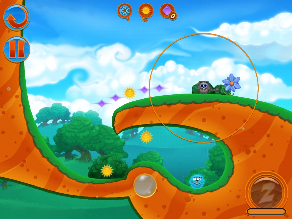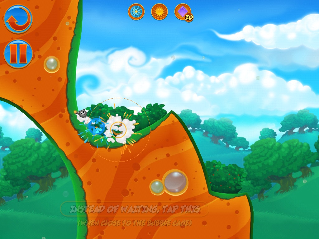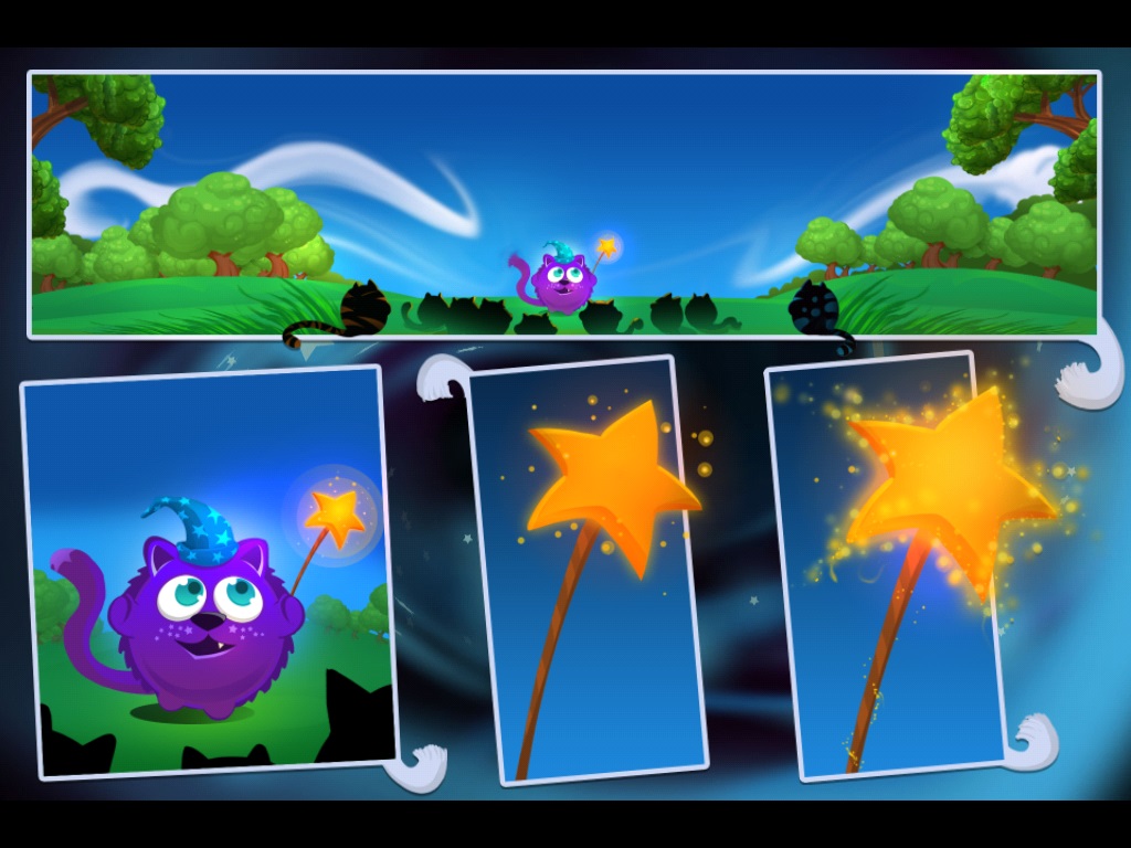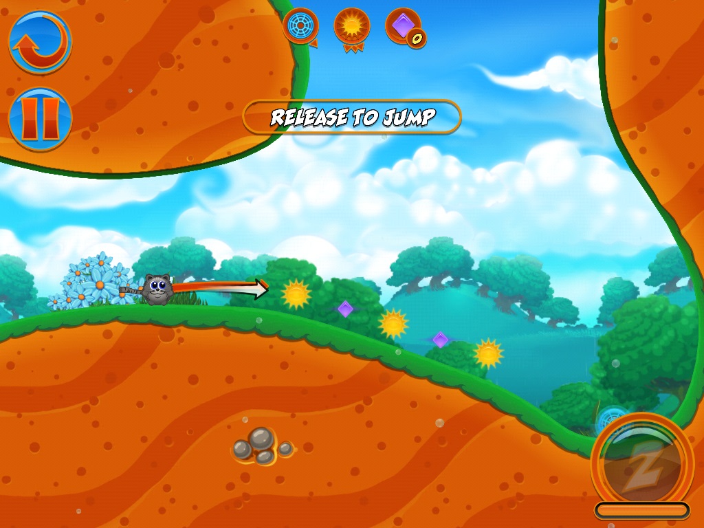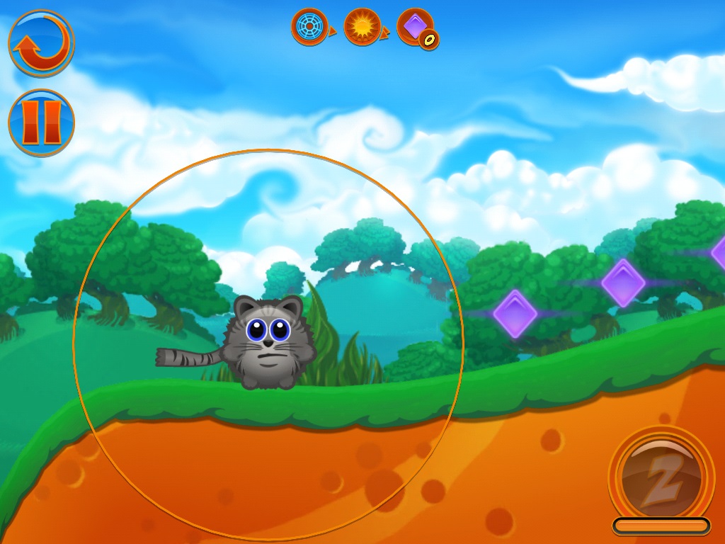 玩法,畫面場景的一端玩家可以看到作為達成關卡目標的「被包覆小貓藍色能量球體」。而玩家要使用手指在畫面上拉動、並控制彈射的方向,使我方的大貓咪飛躍半空至能量球旁。