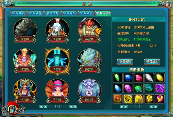 兄弟齊心,其利斷金!宗派 BOSS 分為普通與特殊 BOSS。宗派的每位成員皆可消耗元寶召喚特殊 BOSS,成功召喚者可隨機獲得一件四象金裝,共同參與擊殺的成員也有機會獲得豐厚獎勵。而普通 BOSS 則需宗派達到一定等級後,由掌教、副掌教進行召喚,普通 BOSS 除了會掉落寶石材料外,更有機率掉落鍛鍊紫色神裝的碎片喔!