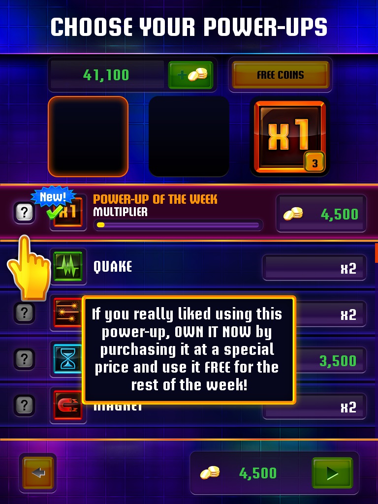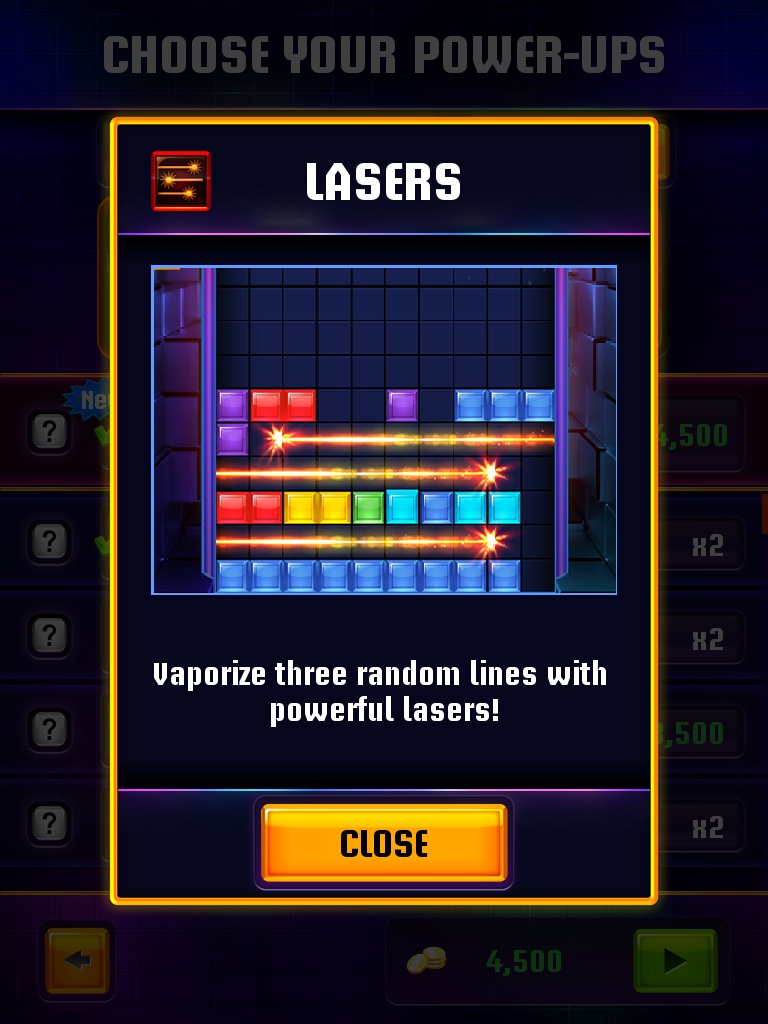 除此之外遊戲中還有其他特殊物品供玩家在開啟遊戲前使用獲得的金幣購買裝備,像是能啟動的毀滅雷射的「激光閃閃」、震碎所有方塊回歸成 1X1 方格而迅速造成消去效果的「地震四方」、將所有方塊拉向左邊螢幕重新整理的「萬有引力」等,都能相當有效的幫助玩家累積積分。此外官方每周還有限定道具功玩家使用,也是額外增加遊戲內容的功能。
