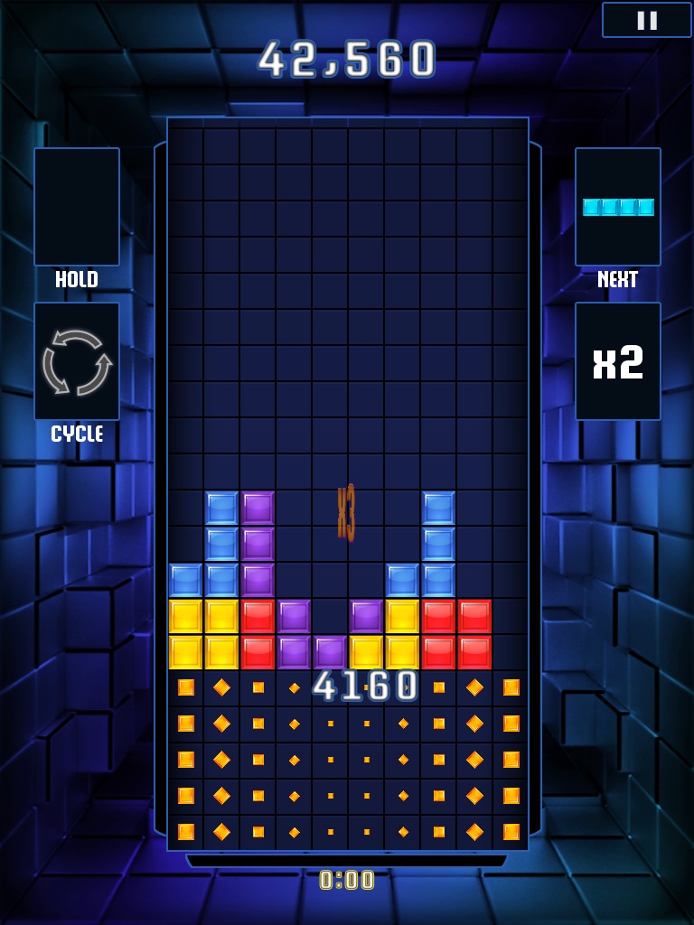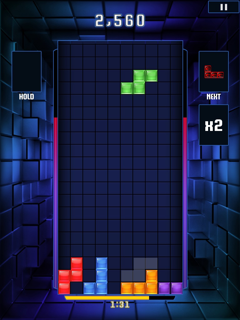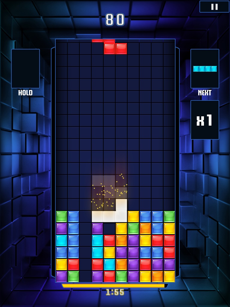 先看到關鍵字閃電戰「Blitz」就可以知道本作是一款限時積分挑戰的類型作品,基礎規則沒有改變。遊戲中可看到幾個熟悉形狀的方塊由上方依序落下,玩家就要按照適合的形狀將之排列組合,使其連結為沒有缺口的直線然後消除,在限定的時間內求取最大積分。