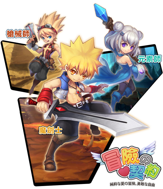 冒險契約》共有三種職業,分別為【魔劍士】、【元素師】、【槍械師】,每個職業各有其獨特的攻擊方式,在炫麗的技能中,蘊藏著的是他們各自為了世界的美好而努力的熱血靈魂。