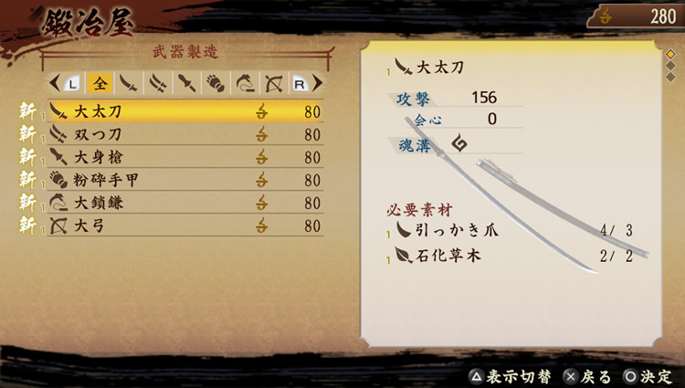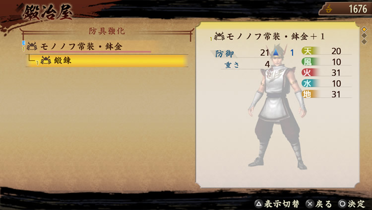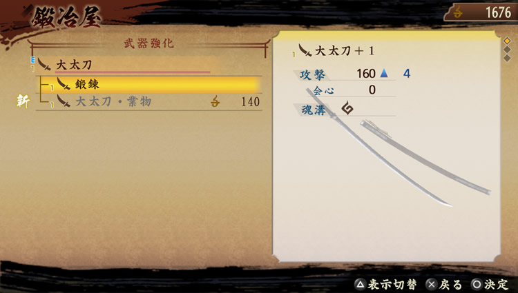 可提升武器跟防具的性能。最多可鍛鍊9次,鍛鍊過的武器會增加魂溝(※)。可讓武器上所設定的「熟練度(馴染み度)」(※)提升到最大。