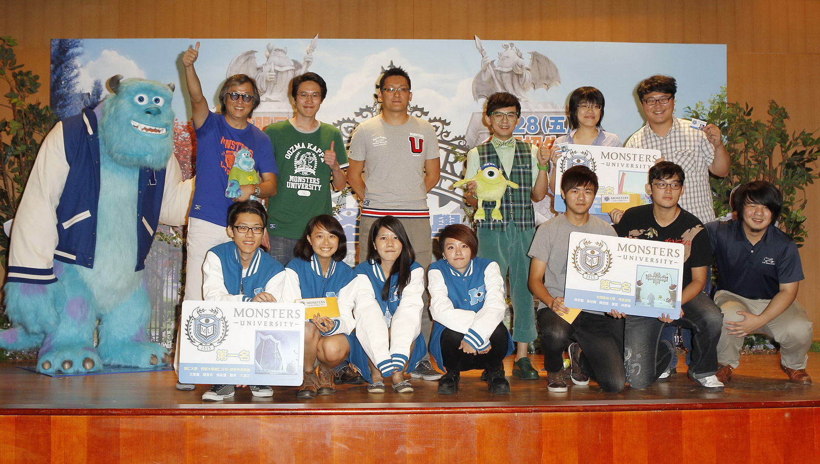 這兩位「台灣之光」同時也是本次《怪獸大學》設計比賽的評審之一,兩人直誇台灣學生的作品真的非常有看頭,勉勵大家要繼續朝著自己的夢想邁進。而王偉忠與黃子佼也是覺得台灣學生創意十足,鼓勵學生們要多體驗生活,而且要更勇於表現自我。記者會最後頒發《怪獸大學》設計比賽冠、亞、季軍的獎學金與獎狀,分別為輔仁大學、台灣藝術大學與政治大學的學生們,每位學生還都分別領到了《怪獸大學》的實體學生證,象徵正式成為《怪獸大學》的榮譽學生!