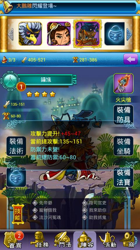 而玩家在上裝備或是選擇新角色時,遊戲畫面即顯示攻防數值的變化,讓玩家對各種裝備功能、星將隊伍的組合效果更一目了然。