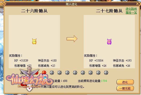 全新隨從造型閃亮登場!讓你愛不釋手關愛有加,他是你的小天使,更是你戰鬥中不可或缺的重要夥伴,現在它已華麗變身,樣子更可愛個性,威力更加驚人!人物等級 96 級開啟該系統,隨從介面中,增加“隨從進化”按鈕,從該按鈕進入隨從進化介面。玩家使用進化能量為隨從升星,每升 1 星可獲得對應的屬性,當隨從升滿 10 星後,自動升階,每升 1 階可獲得額外的獎勵屬性以及新的隨從形象哦!
