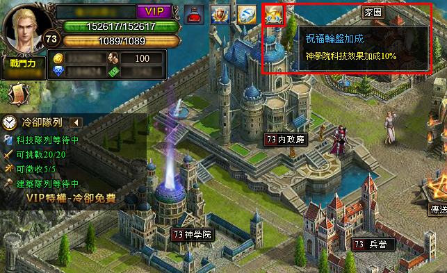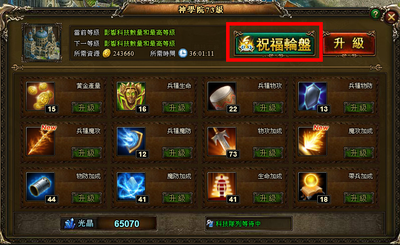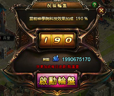 初始狀態的『祝福輪盤』BUFF 為『神學院科技效果加成 10%』,如想要獲得更好的加成,可通過點擊『神學院』中的『祝福輪盤』按鈕,進入到轉盤面板消耗一定數『光晶』啟動轉盤,隨機獲取更強大的 BUFF 效果。