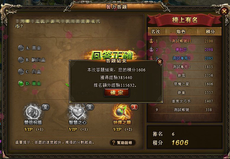 『智力競答』活動時間為週一、三、五晚上 19:30~20:00,期間玩家通過介面右上方的『在線答題』按鈕,即可打開『之力答題』活動面板,參與活動。