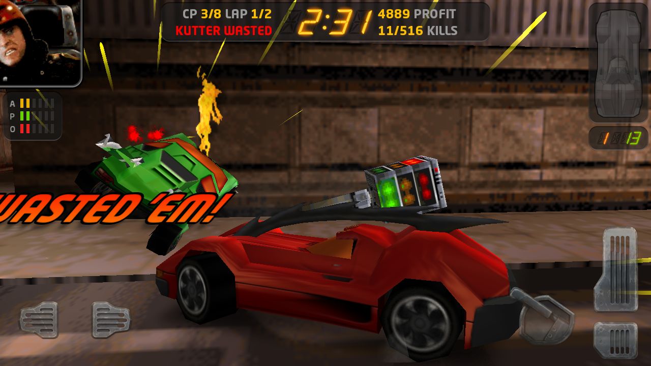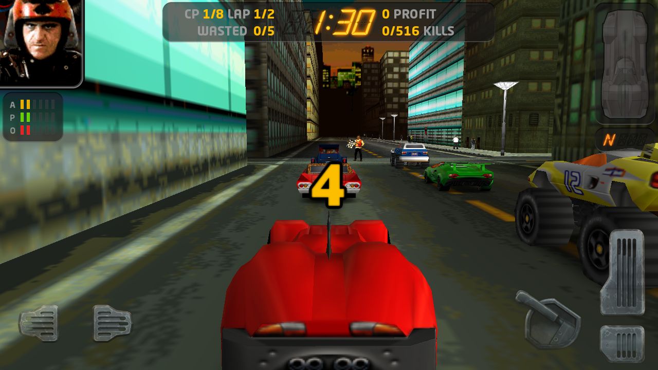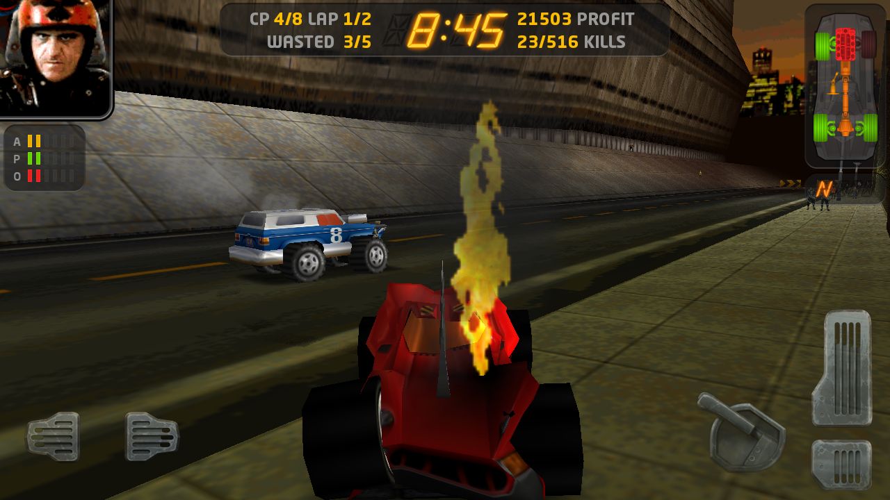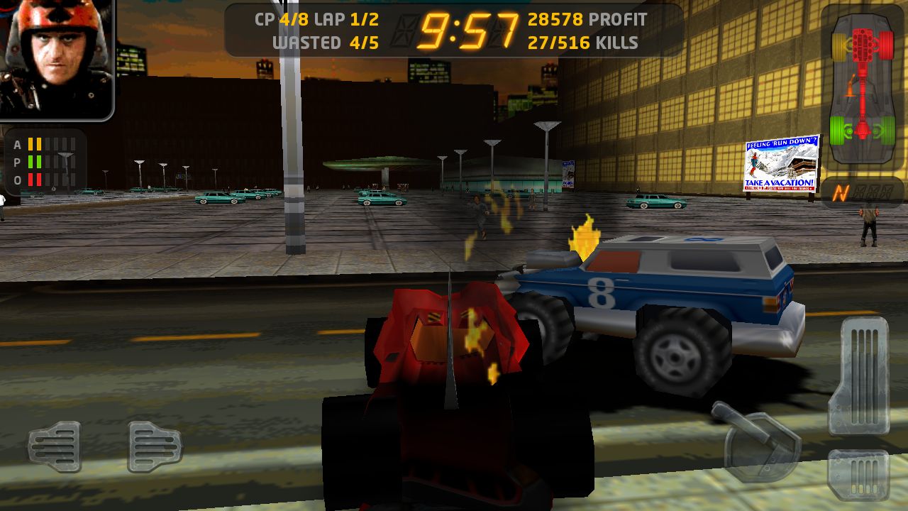 進入比賽後得操縱方式也很直覺,玩家可以透過左下角的按鍵來控制左右方向,右下角的三個一組的按鈕則分別是油門、煞車(後退)以及手煞車。比較需要說明的是右上角的車體圖示,當玩家的車輛受到撞擊,損害就會顯現上右上角的圖示裡,這時只要玩家身上有金幣(透過撞路人、對手獲得),就可以點擊圖示中受損的部位立即修復傷害。