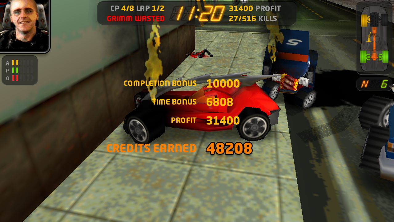 而左上角的相片則是即時顯示玩家車輛駕駛的狀態,他會隨著玩家的駕駛座出許多有趣的反應,例如撞到敵人時會叫囂、車子卡住時會飆髒話,甚至當你開太快時他還會喔喔喔的鬼叫,若是嫌他太吵也可把它關起來。