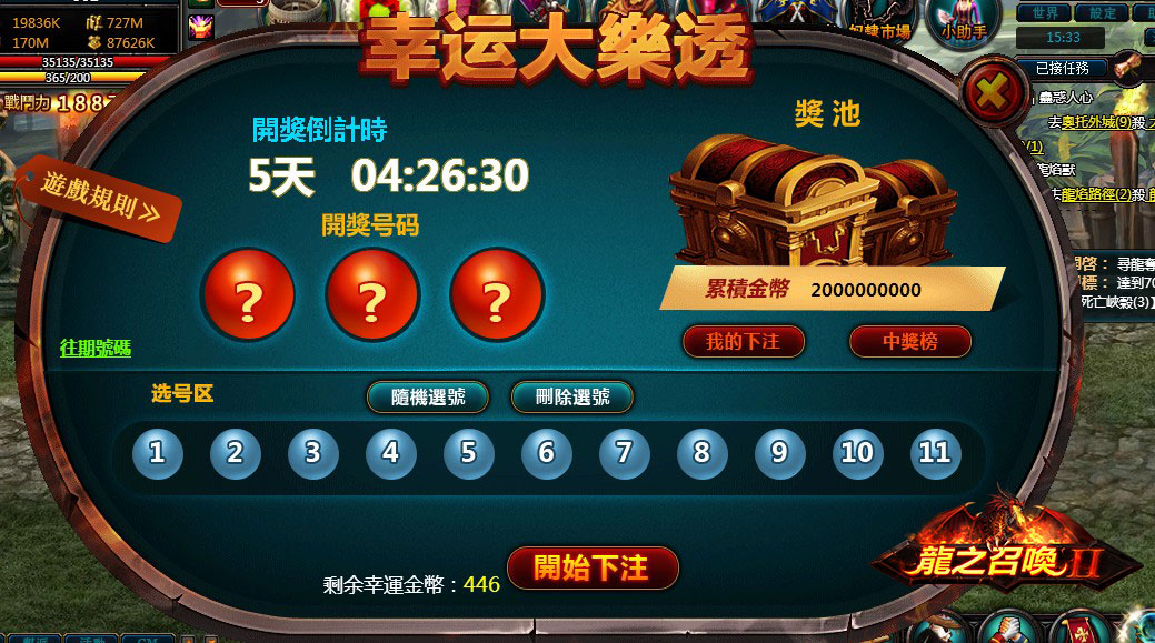 改版後,於 25 級開啟「大樂透」功能,與我們現實生活中的樂透相似,每週一開始獎金累積至周日晚間 7 點,這期間玩家可以下注最多 10 組,並消耗自陣營戰、世界 BOSS 取得的「幸運金幣」。每周日晚間 8 點開獎,玩家選擇的每組數字,與系統開出的每組彩號匹配度愈高,獎金愈高!