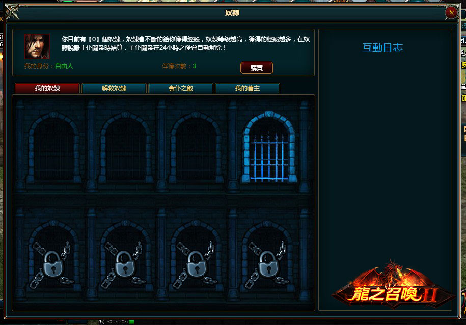 第二,玩家通過副本「隱蔽的部落營地 (2)」之後,可開啟「奴隸市場」系統。當玩家於競技場、護戒中戰勝對手,玩家就可以到奴隸市場介面中查看手下敗將列表,進行俘獲。若目標已經是別人的奴隸,則需要擊敗目標現任主人才可以喔!主僕關係可維持 24 小時,解除後會依據奴隸的等級獲得相對應的經驗獎勵。除了俘虜奴隸,玩家也可以當英雄,到「解救奴隸」面板拯救好友!