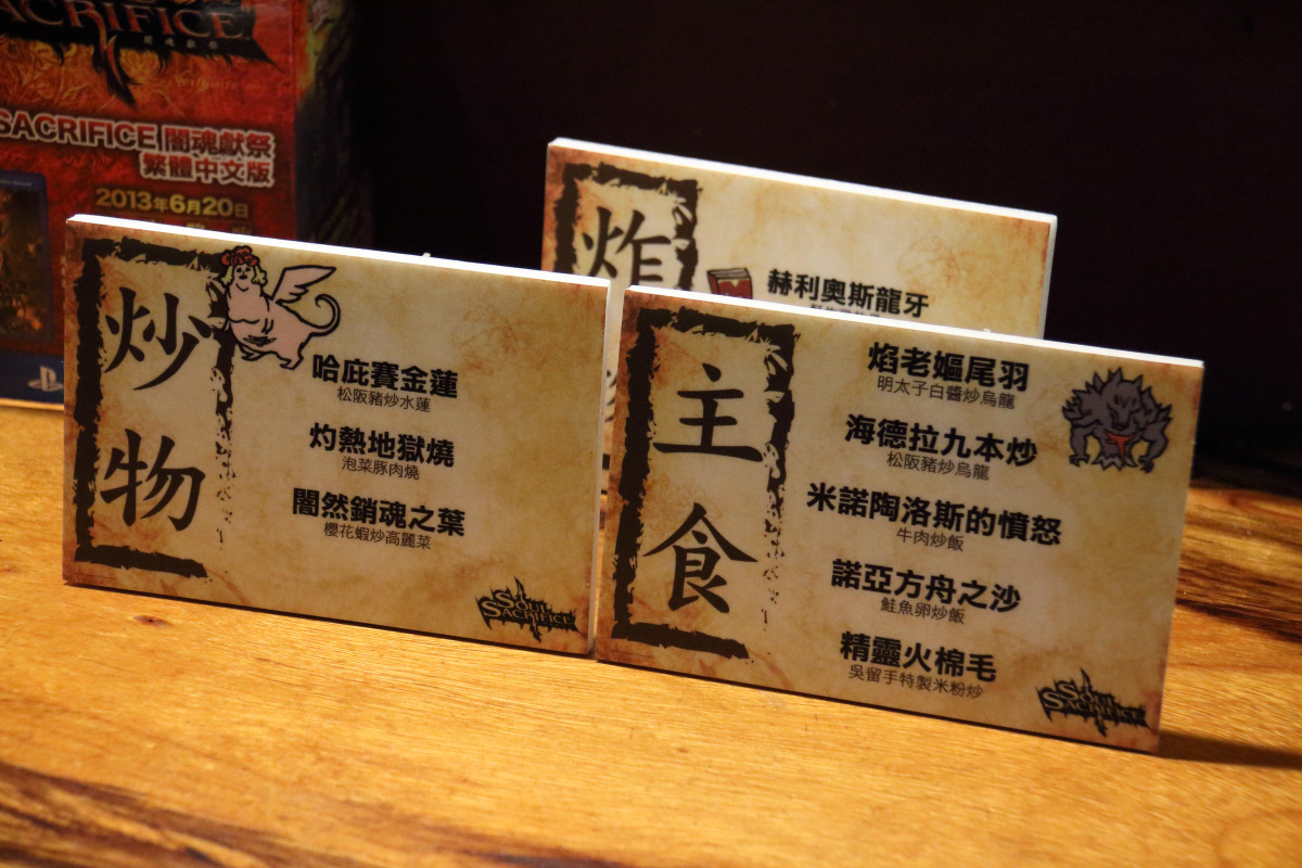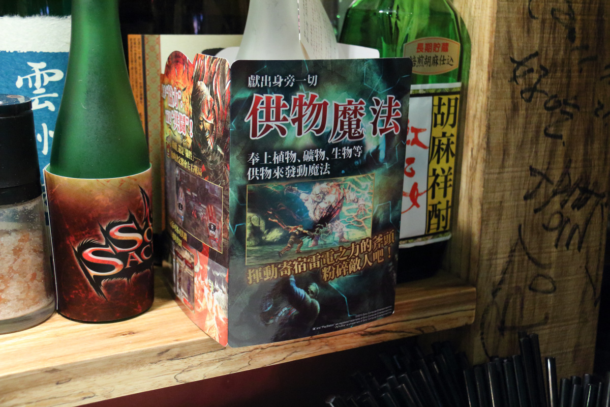 闇魂獻祭 》的黑暗奇幻風格,不論是門簾或是窗格都充滿遊戲的美術元素,另外還提供配合遊戲主題精心設計的菜單,替常見的居酒屋料理冠上響亮的奇幻風格名稱,像是米諾陶洛斯的憤怒(牛肉炒飯)、闇然銷魂之葉(櫻花蝦炒高麗菜)、黏生物之塊(胡麻嫩雞)等,非常有趣。