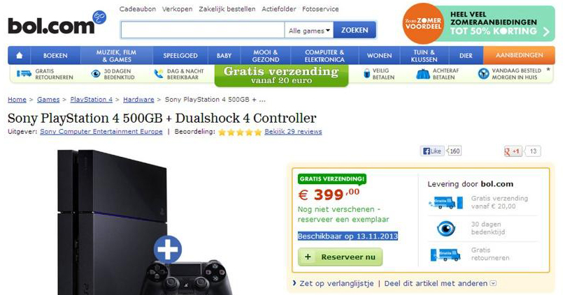 德資背景的 Media Markt,號稱是全歐洲最大的消費電器零售商,全球規模可能僅次於美國 3C 零售巨頭 Best Buy。除了這家位於阿姆斯特丹的 Media Markt 外,荷蘭另一網路商城 bol.com 同樣透漏 PS4 首發日期為今年 11 月 13 日。然而,該日期可能只是歐版 PS4 的發售時間,其餘地區首發時間仍是個謎。索尼電腦娛樂歐洲公司(Sony Computer Entertainment Europe)發言人表示,這是零售商的宣傳噱頭,僅表示 PS4 將會於「2013 假期」開始發售。