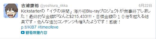 日本新銳動畫導演吉浦康裕的劇場版動畫作品《夏娃的時間 劇場版》在美國募資網站 Kickstarter 中已成功募資超過 21 萬 5433 元美金,確定將發行英文版 BD 。