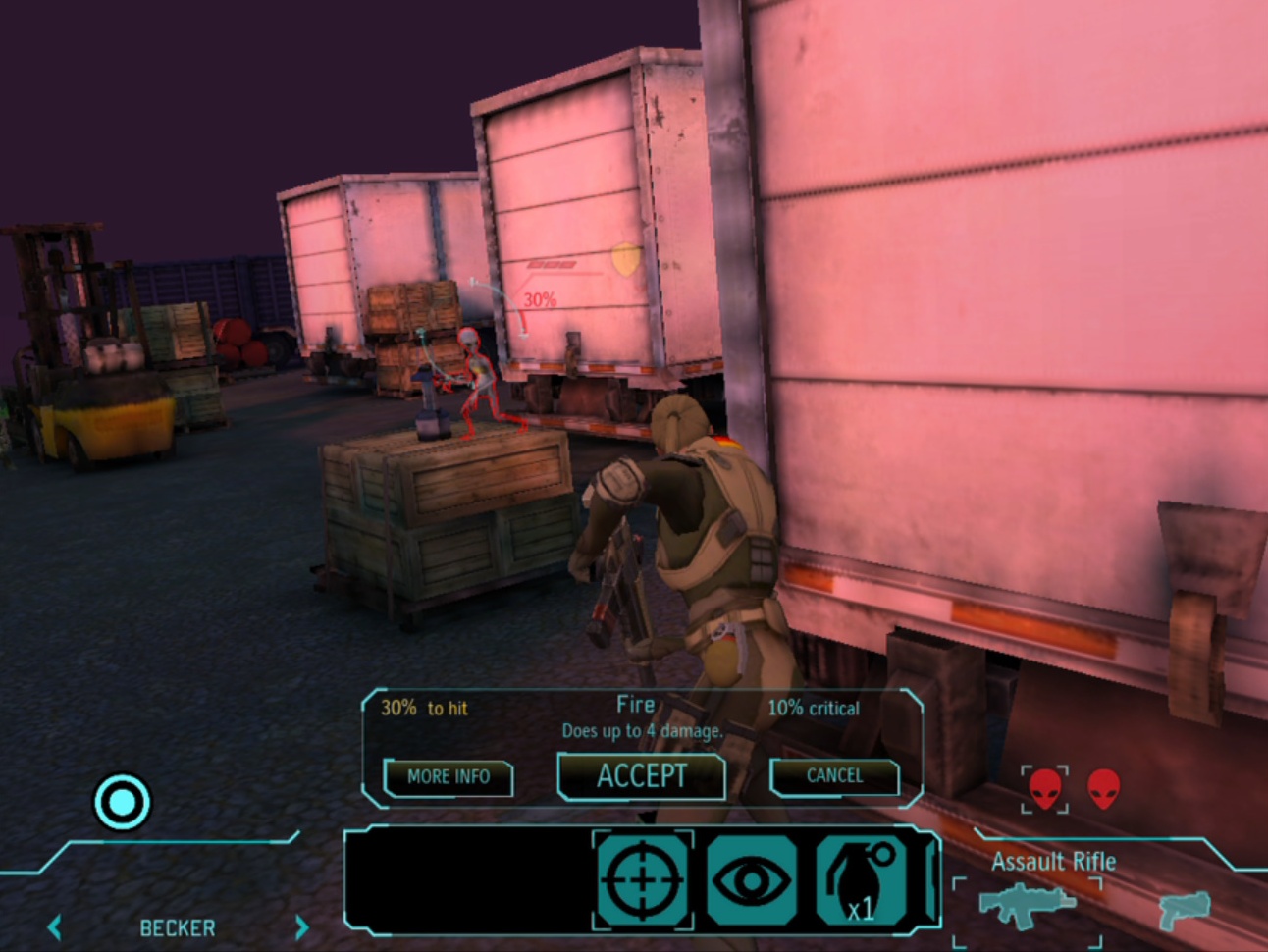 《XCOM:Enemy Unknown》中,玩家得操作 XCOM 的隊員前往世界各地阻止外星人的侵略行動。戰鬥時採用回合制的方式,敵我雙方輪流行動,由於是使用現代高科技槍砲武器進行戰鬥,所以移動時可得找好掩體躲避敵方砲火,同時也要想辦法移動到敵方側翼進行夾擊,提高命中率。