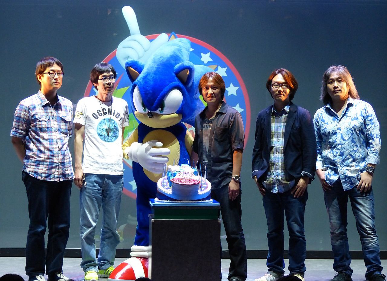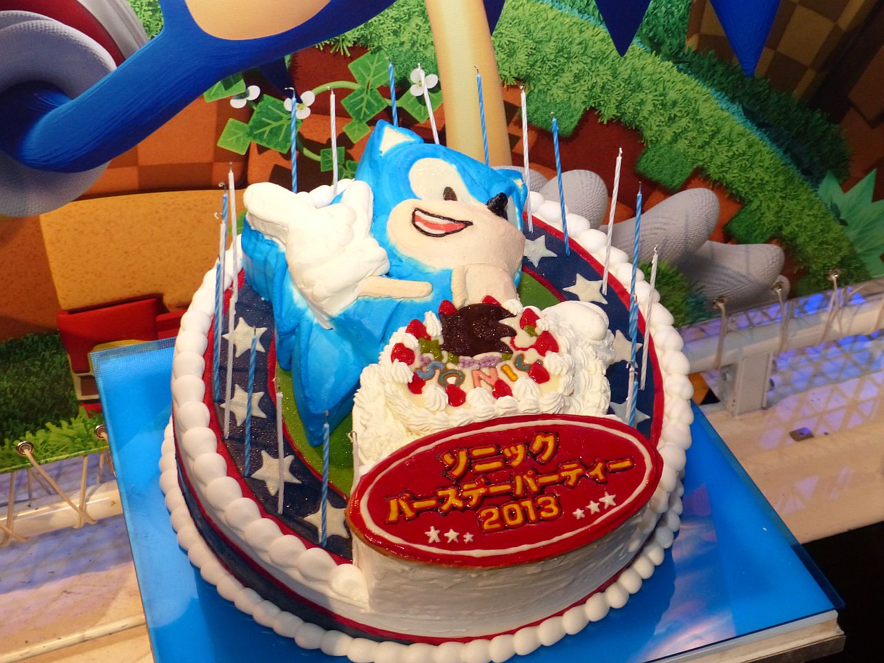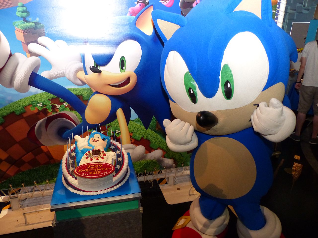 舞台活動結束後,索尼克滿心愉悅的在生日蛋糕旁接受拍照留念。蛋糕最後應該會被工作人員吃掉吧?