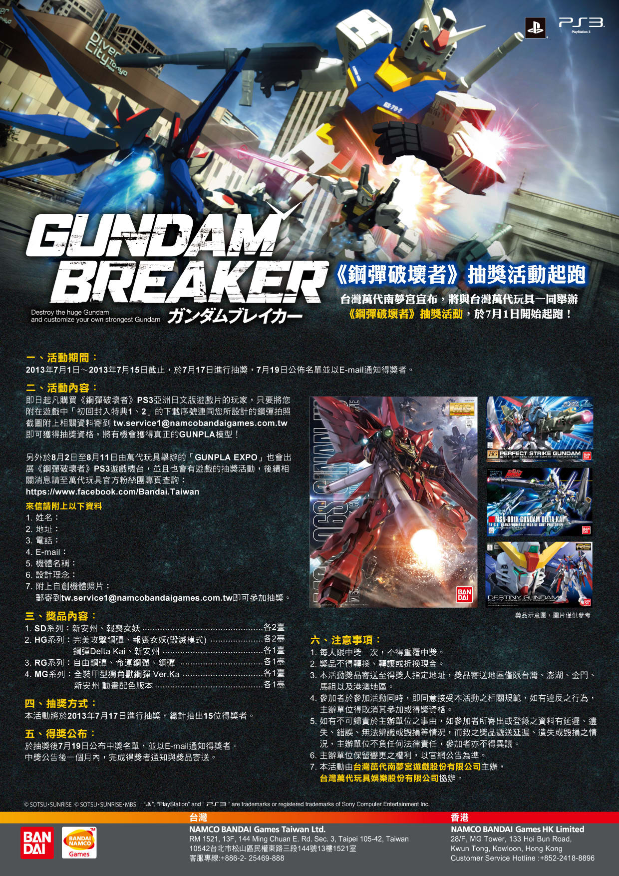 即日起凡購買《鋼彈破壞者》PS3 亞洲日文版遊戲片的玩家,只要在遊戲中「初回封入特典1、2」的下載序號連同本人所設計的鋼彈拍照截圖附上相關資料,寄到 tw.service1@namcobandaigames.com.tw 即可獲得抽獎資格,將有機會獲得實體 GUNPLA 模型。