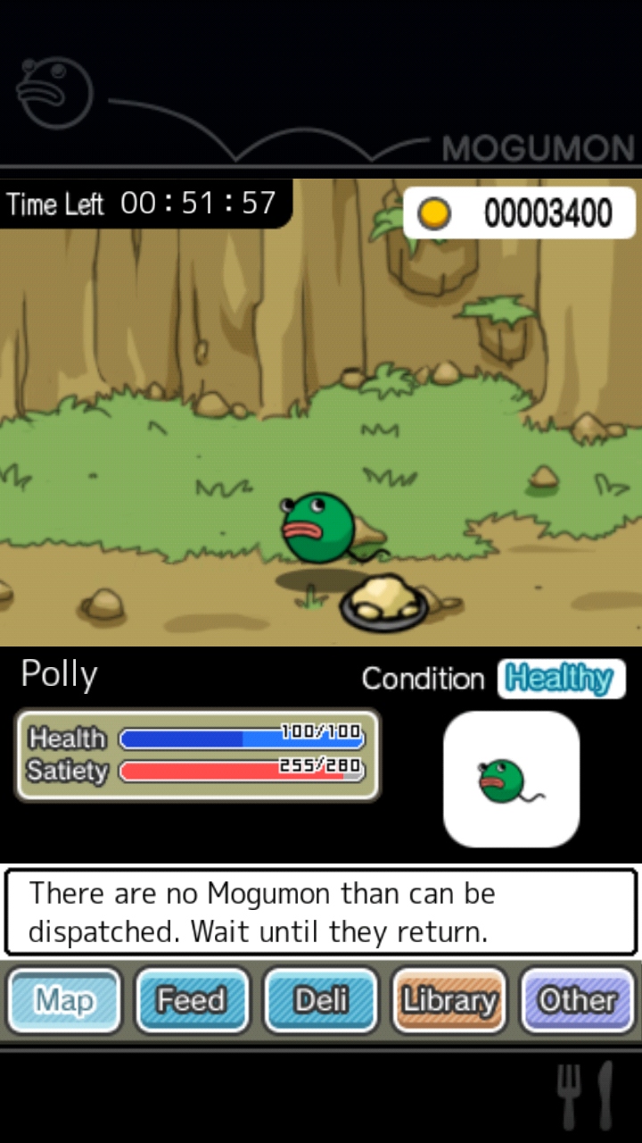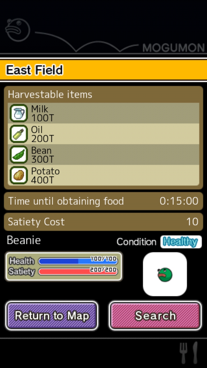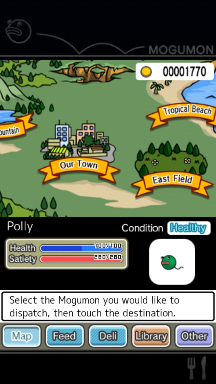 從圖鑑裡也可以看到目前所有收藏的 Mogumon 進化型態,也可從地圖中看到目前可前往的區域。由於 Mogumon 每次進化都會開放新的地圖供玩家探索,因此可以探險的地方也會愈來愈多。需要注意的是,如果前往的地方愈遠就需要耗費愈多時間,同時派遣中的 Mogumon 也不能進行餵食等其他動作,也不能中途取消!因此如果沒有定時關注 Mogumon,其健康與快樂值就會下降以至生病,需要再花時間照顧。